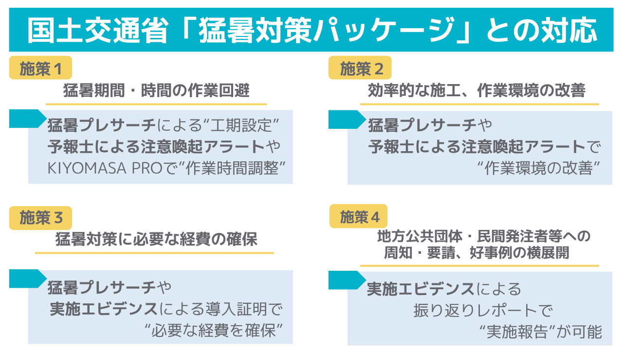 2025年末に国土交通省で策定された「建設工事における猛暑対策サポートパッケージ」。この仕組みをフル活用できるよう、気象会社だからこそできる支援を盛り込んだプランが「猛暑・熱中症対策サポートプラン」です。