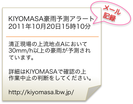 本サービスは、KIYOMASA PROとの連携が抜群です。過去にさかのぼって、KIYOMASA PRO予報データや、豪雨や強風、警報注意報アラートメールの履歴も取り出すことができます。これにより、作業の中止を判断したタイミングの気象データを帳票としてまとめることができます。